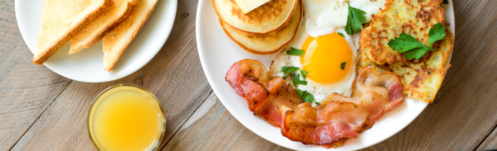 Streaky bacon, eggs, grained toasts, roast tomato, kransky sausage, baked beans and butter